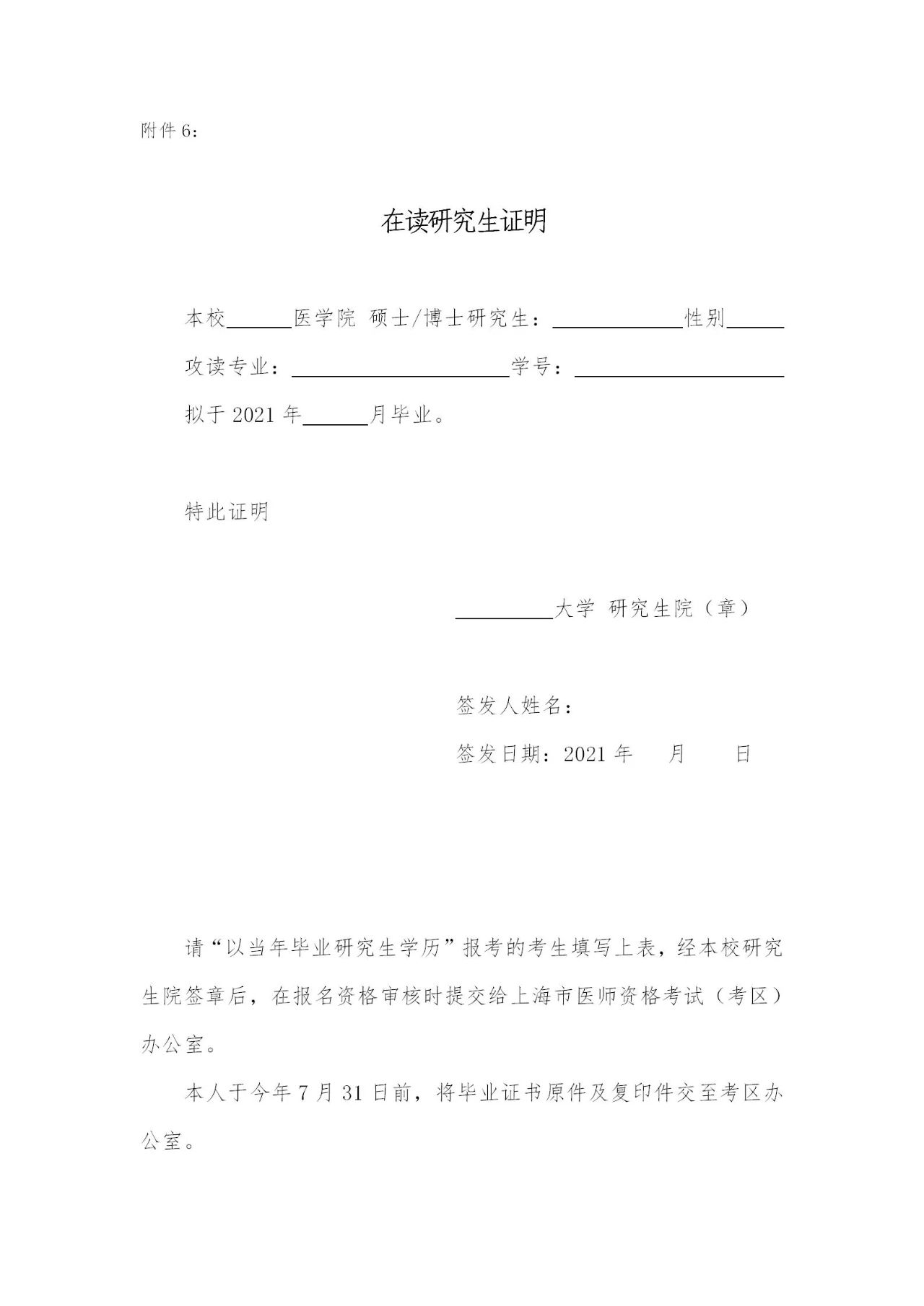 附件:2021年上海市醫(yī)師資格考試報名在讀研究生證明模板及填寫要求