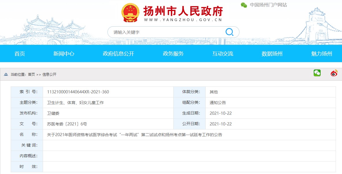 揚州考點2021年醫(yī)師資格醫(yī)學(xué)綜合第一試延考工作的公告