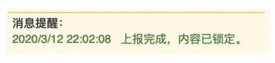 注意:提交后,考生界面會顯示上報完成,內容已鎖定的提示(鎖定即無法自行修改上傳材料),表示上傳成功。如下圖提示: