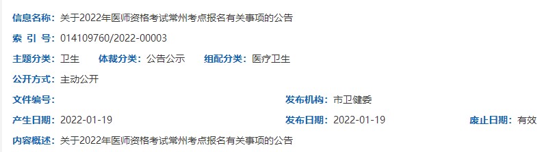 江蘇省關(guān)于2022年醫(yī)師資格考試常州考點報名有關(guān)事項的公告