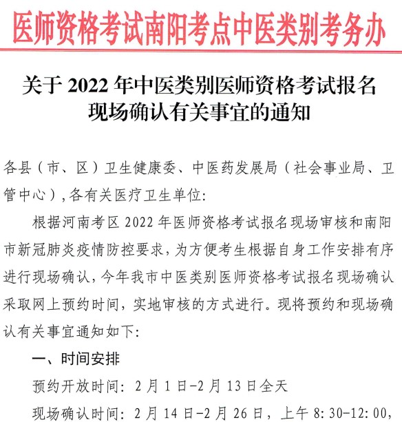 南陽(yáng)市關(guān)于2022年中醫(yī)類別醫(yī)師資格考試報(bào)名現(xiàn)場(chǎng)確認(rèn)有關(guān)事宜的通知