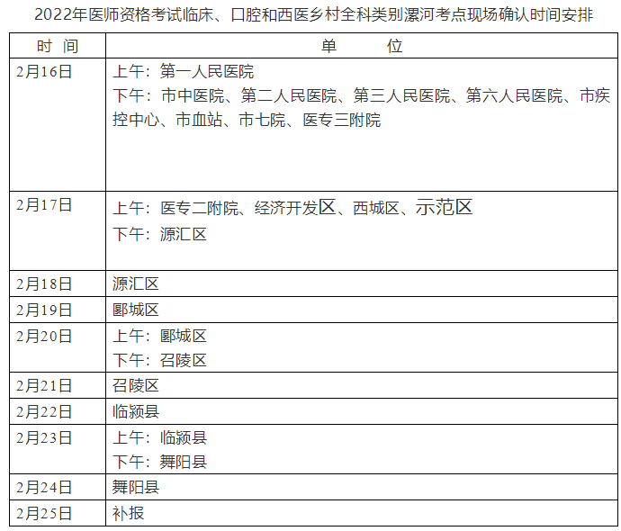 2022年醫(yī)師資格考試臨床、口腔和西醫(yī)鄉(xiāng)村全科類別漯河考點現(xiàn)場確認(rèn)時間安排