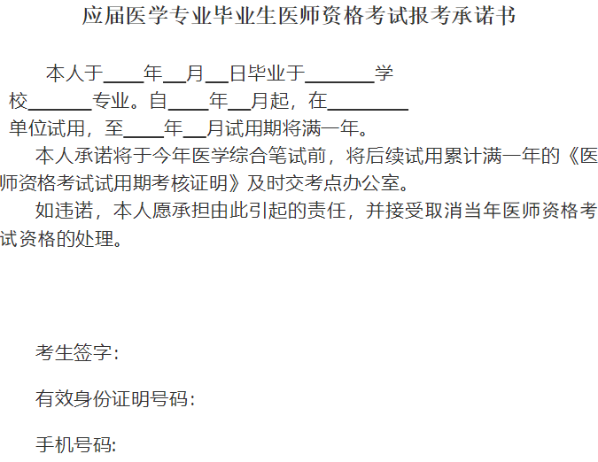 如違諾,本人愿承擔(dān)由此引起的責(zé)任,并接受取消當(dāng)年醫(yī)師資格考試資格的處理。