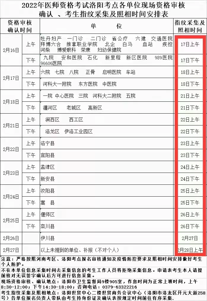 2022年醫(yī)師資格考試洛陽(yáng)考點(diǎn)各單位現(xiàn)場(chǎng)資格審核確認(rèn)、考生指紋采集及照相時(shí)間安排