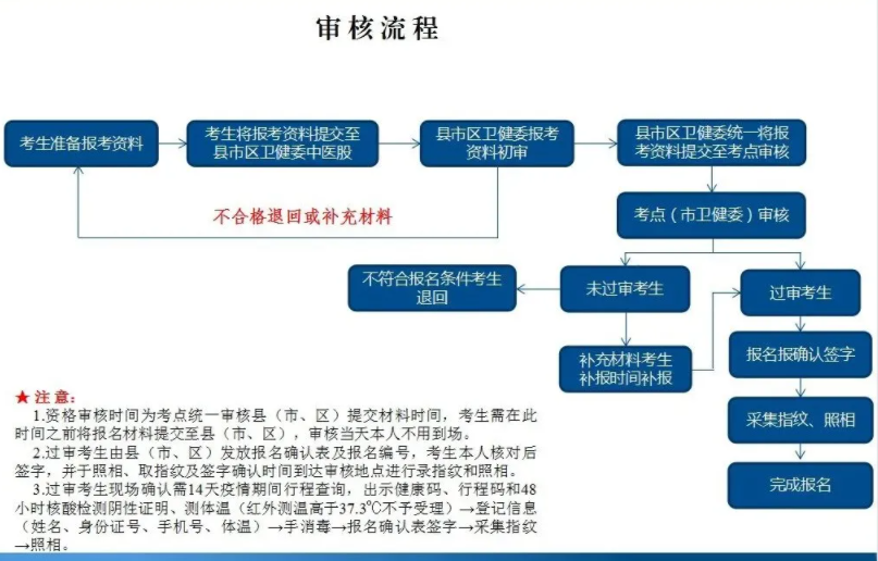 根據(jù)疫情防控要求,為減少考生現(xiàn)場報(bào)名審核停留時(shí)間,由各縣市區(qū)衛(wèi)生健康委負(fù)責(zé)收集、整理考生報(bào)名材料,并對考生報(bào)名材料進(jìn)行初審,經(jīng)初審合格的報(bào)名材料統(tǒng)一報(bào)送至考點(diǎn)現(xiàn)場審核地點(diǎn)進(jìn)行報(bào)名資格審核。經(jīng)考點(diǎn)報(bào)名資格審核合格的考生由各縣市區(qū)衛(wèi)生健康委通知考生按照以下流程完成報(bào)名資格現(xiàn)場審核確認(rèn)。