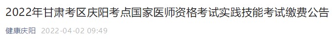 2022年甘肅考區(qū)慶陽考點國家醫(yī)師資格考試實踐技能考試繳費公告