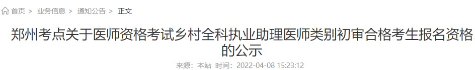 鄭州考點(diǎn)關(guān)于醫(yī)師資格考試鄉(xiāng)村全科執(zhí)業(yè)助理醫(yī)師類別初審合格考生報(bào)名資格的公示