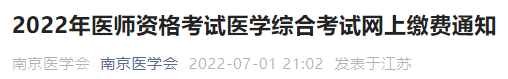 南京考點發(fā)布2022年醫(yī)師資格考試醫(yī)學(xué)綜合考試網(wǎng)上繳費通知