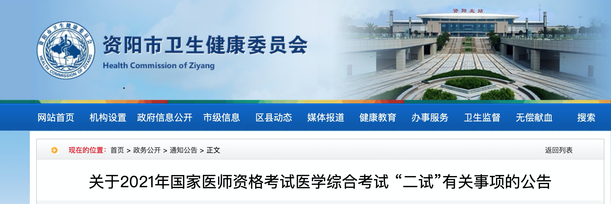 四川資陽市2021年國家醫(yī)師資格考試醫(yī)學綜合考試 “二試”有關事項的公告