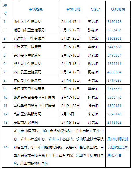 考生醫(yī)療機(jī)構(gòu)所在的縣(市、區(qū)、自治縣)衛(wèi)生健康局、樂山高新區(qū)公共服務(wù)局和各有關(guān)醫(yī)療單位(下表第13和14所列醫(yī)療機(jī)構(gòu))。