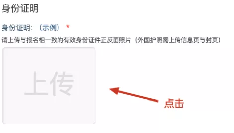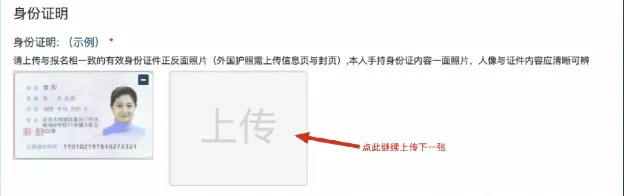 以身份證明上傳為例,點(diǎn)擊“示例”查看要求,再點(diǎn)“上傳”按鈕,進(jìn)入上傳圖片界面,將個(gè)人已經(jīng)準(zhǔn)備好的圖像文件上傳。如下圖: