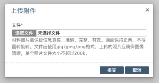 材料照片需保證信息真實(shí)、準(zhǔn)確、完整、有效。畫面保持正向,不得翻轉(zhuǎn)旋轉(zhuǎn)。文件應(yīng)使用jpg/jpeg/png格式,上傳的照片應(yīng)確保圖像清晰,單個(gè)照片文件大小不超過200k。