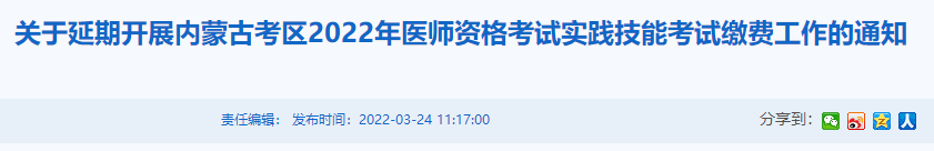 因受新冠肺炎疫情影響,原定于2022年3月25日-31日開展的內蒙古考區(qū)2022年醫(yī)師資格考試實踐技能考試階段的繳費工作延期進行,具體繳費時間另行通知。