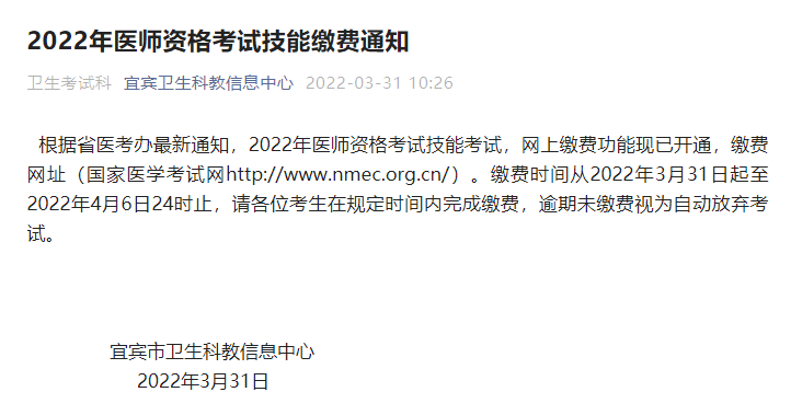 四川宜賓2022年醫(yī)師資格考試技能繳費(fèi)通知!