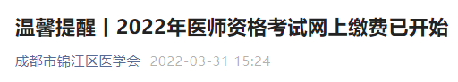 成都市錦江區(qū)溫馨提醒丨2022年醫(yī)師資格考試網(wǎng)上繳費(fèi)已開(kāi)始