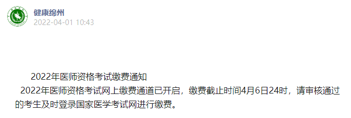 四川綿州2022年醫(yī)師資格考試網上繳費通道已開啟,繳費截止時間4月6日24時,請各位考生注意、相互轉告,別錯過繳費時間哦!