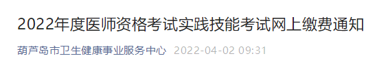 葫蘆島市2022年度醫(yī)師資格考試實踐技能考試網(wǎng)上繳費通知