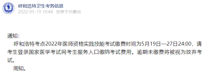 呼和浩特考點2022年醫(yī)師資格實踐技能考試?yán)U費時間已定!