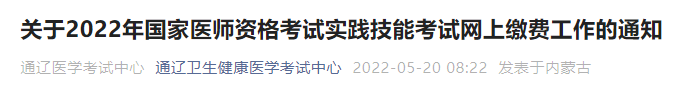 2022年通遼市國家醫(yī)師資格考試實(shí)踐技能考試網(wǎng)上繳費(fèi)工作的通知