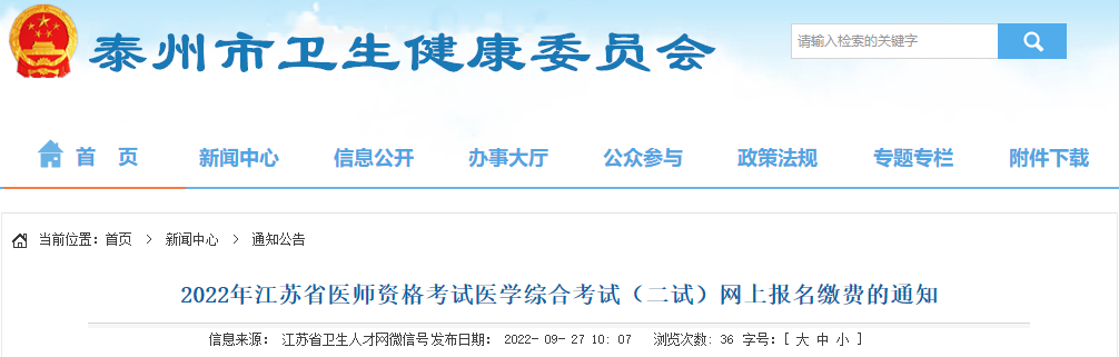 2022年江蘇泰州市醫(yī)師資格考試醫(yī)學(xué)綜合考試(二試)網(wǎng)上報(bào)名繳費(fèi)的通知