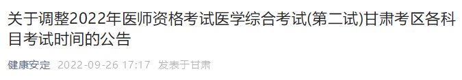 甘肅省定西市安定區(qū)關(guān)于調(diào)整2022年醫(yī)師資格考試醫(yī)學(xué)綜合考試(第二試)各科目考試時間的公告