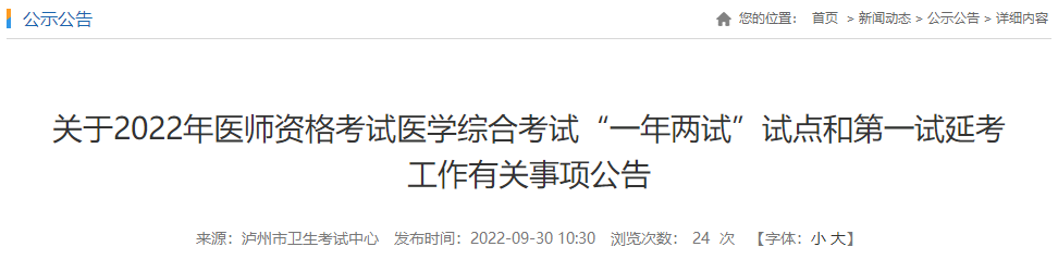 瀘州市關(guān)于2022年醫(yī)師資格考試醫(yī)學(xué)綜合考試“一年兩試”試點(diǎn)和第一試延考工作有關(guān)事項(xiàng)公告