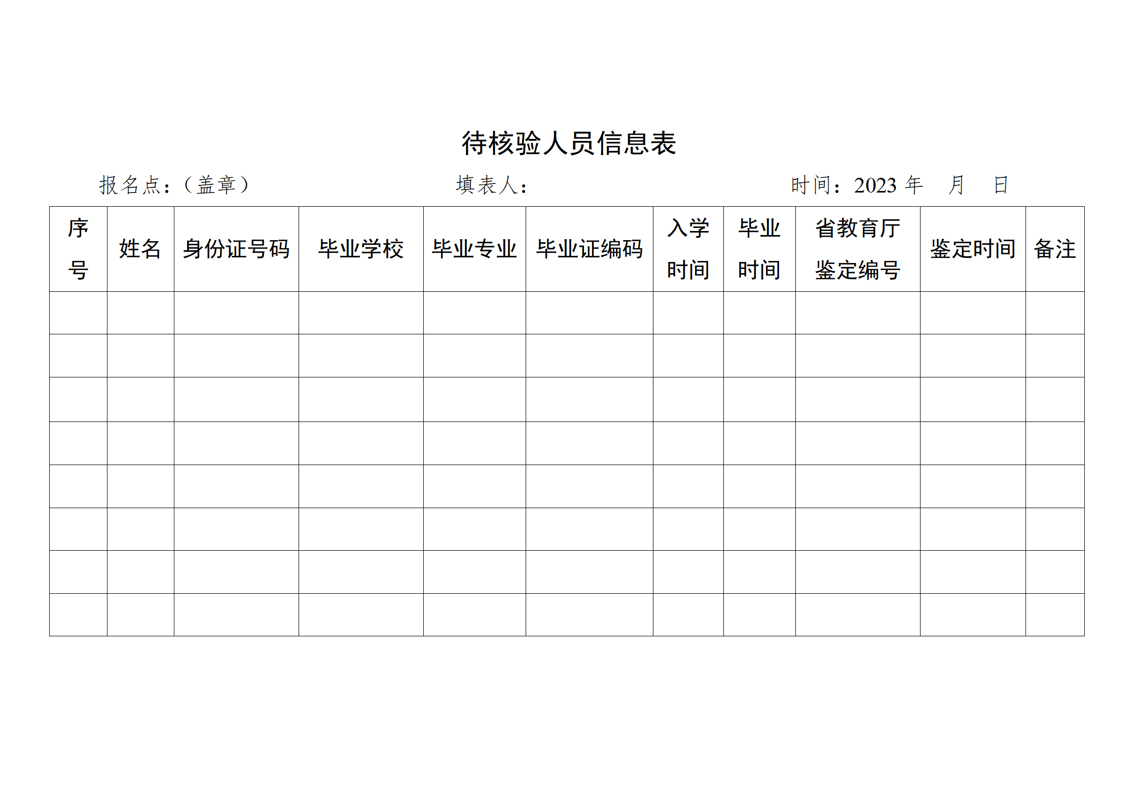 2023年度全國醫(yī)師資格考試廣州考點報名工作計劃的公告已出,廣州市2023年醫(yī)師資格考試待核驗人員信息表模板如下。