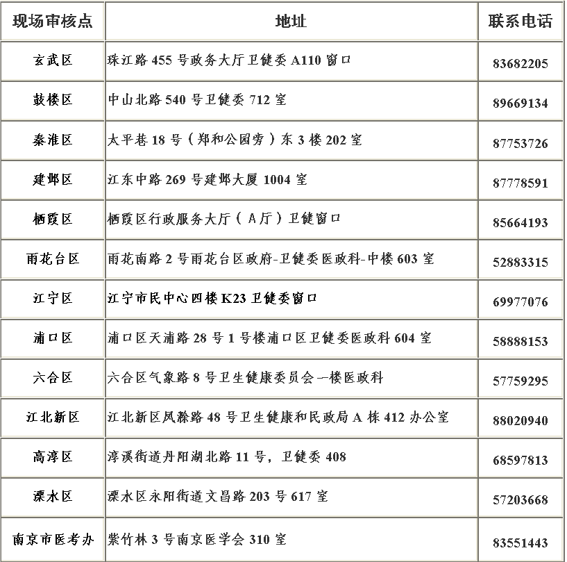 2.除上述單位以外的各級各類醫(yī)療機構(gòu)的考生,按照屬地化原則到機構(gòu)所在區(qū)衛(wèi)健委現(xiàn)場審核點(詳見下表)上交報名材料,各區(qū)衛(wèi)健委將全區(qū)考生的報名材料匯總后,按照規(guī)定的時間報送至南京市醫(yī)考辦。