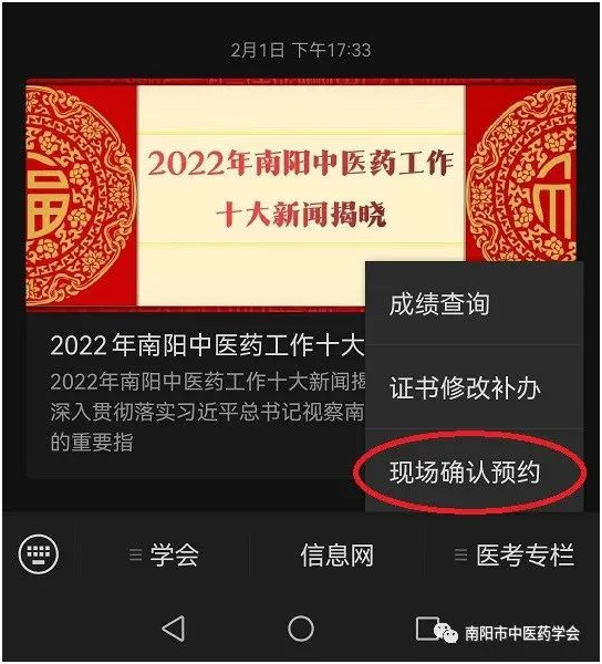一、微信搜索“南陽市中醫(yī)藥學(xué)會”公眾號,進(jìn)入后點(diǎn)擊右下方“醫(yī)考專欄”,再點(diǎn)擊“現(xiàn)場審核預(yù)約”(見下圖)。