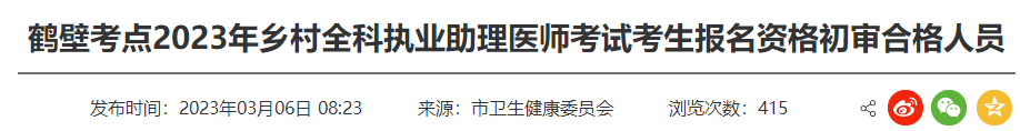 文章標(biāo)題:鶴壁考點(diǎn)2023年鄉(xiāng)村全科執(zhí)業(yè)助理醫(yī)師考試考生報(bào)名資格初審合格人員