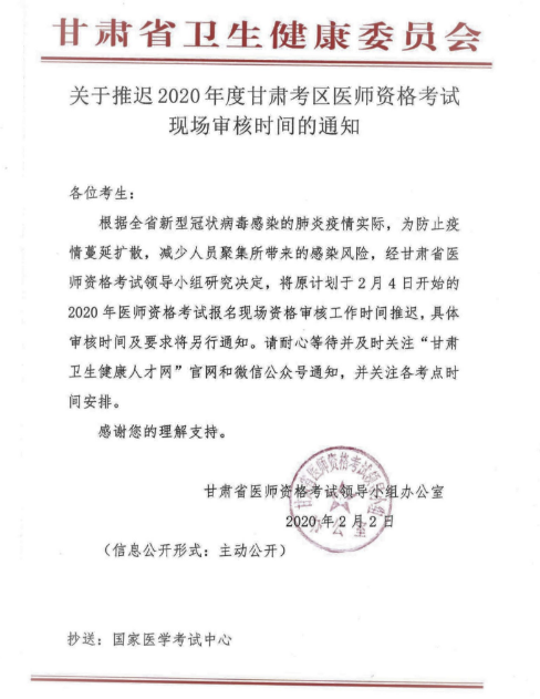 甘肅金昌市推遲2020年醫(yī)師資格考試報名現(xiàn)場審核時間的通知