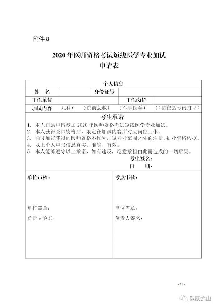 11.參加短線加試的考生需提交《2020年醫(yī)師資格考試短線醫(yī)學(xué)專業(yè)加試申請表》(一式兩份,考區(qū)、考點各留存一份)(附件8)。