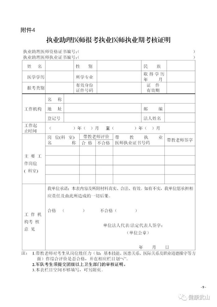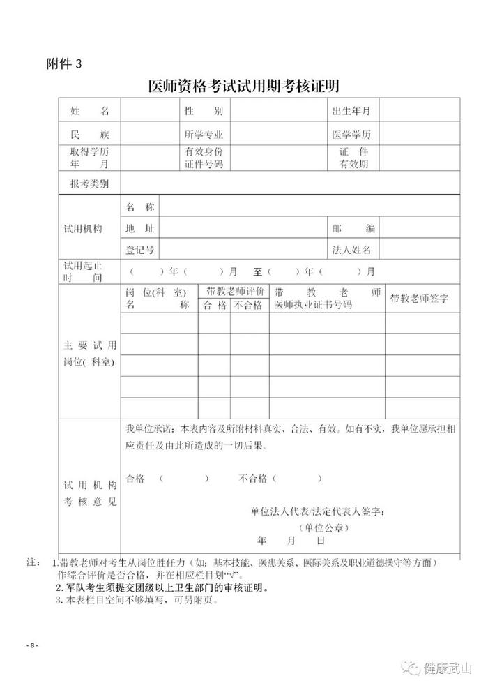 6.考生試用(或?qū)嵙?xí))機構(gòu)出具的《醫(yī)師資格考試試用期考核證明》(附件3)或《執(zhí)業(yè)助理醫(yī)師報考執(zhí)業(yè)醫(yī)師執(zhí)業(yè)期考核證明》(附件4),(期間變更過幾次執(zhí)業(yè)地點的需提供每個執(zhí)業(yè)地點的考核證明,并要求填帶教老師的證書號;如考生執(zhí)業(yè)證丟失或在執(zhí)業(yè)注冊過程中有變更記錄,導(dǎo)致注冊時間不滿足報考年限的,須提供首次執(zhí)業(yè)注冊證明)。