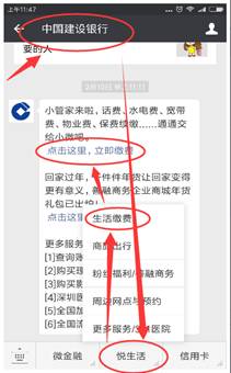 微信關(guān)注“中國(guó)建設(shè)銀行”公眾號(hào),進(jìn)入公眾號(hào),點(diǎn)擊“悅生活”,再點(diǎn)擊“生活繳費(fèi)”,在出現(xiàn)的頁(yè)面點(diǎn)擊“立即繳費(fèi)”。根據(jù)提示完成繳費(fèi)。
