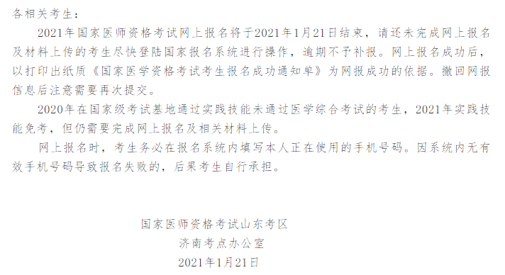 濟南考點2021年醫(yī)師資格考試網(wǎng)上報名截止時間的提示