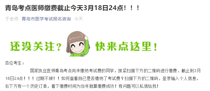 國家執(zhí)業(yè)醫(yī)師青島考點尚未繳納考試費的同學,抓緊掃描下方的二維碼進行繳費,截止到3月18日24點?。?!過期不候??!如何查看自己是否繳納了考試費?掃描下方的二維碼,登錄輸入個人信息,右下方有一個歷史訂單,看下繳費時間為當年就算繳費成功!