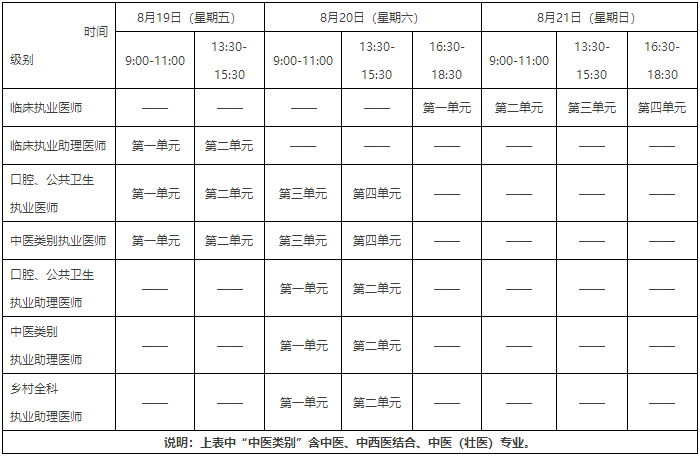 考試實(shí)行計(jì)算機(jī)化考試,軍隊(duì)現(xiàn)役人員加試軍事醫(yī)學(xué)、院前急救崗位和兒科專業(yè)加試相應(yīng)內(nèi)容。中醫(yī)類別蒙醫(yī)、藏醫(yī)、維醫(yī)、哈薩克醫(yī)專業(yè)實(shí)行紙筆考試。統(tǒng)一考試時間如下:
