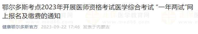 內(nèi)蒙古鄂爾多斯考點(diǎn)2023年開展醫(yī)師資格醫(yī)學(xué)綜合 (二試)網(wǎng)上報(bào)名及繳費(fèi)的通知