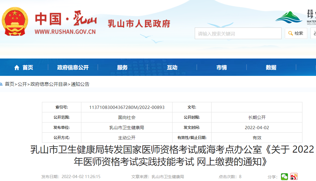 乳山市衛(wèi)生健康局轉(zhuǎn)發(fā)威海考點關(guān)于2022年醫(yī)師資格考試實踐技能考試網(wǎng)上繳費的通知