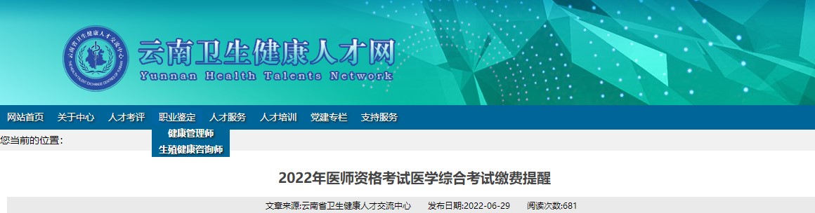 2022年醫(yī)師資格考試醫(yī)學(xué)綜合考試云南考區(qū)繳費提醒