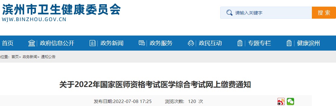濱州考點(diǎn)關(guān)于2022年國家醫(yī)師資格考試醫(yī)學(xué)綜合考試網(wǎng)上繳費(fèi)工作的通知