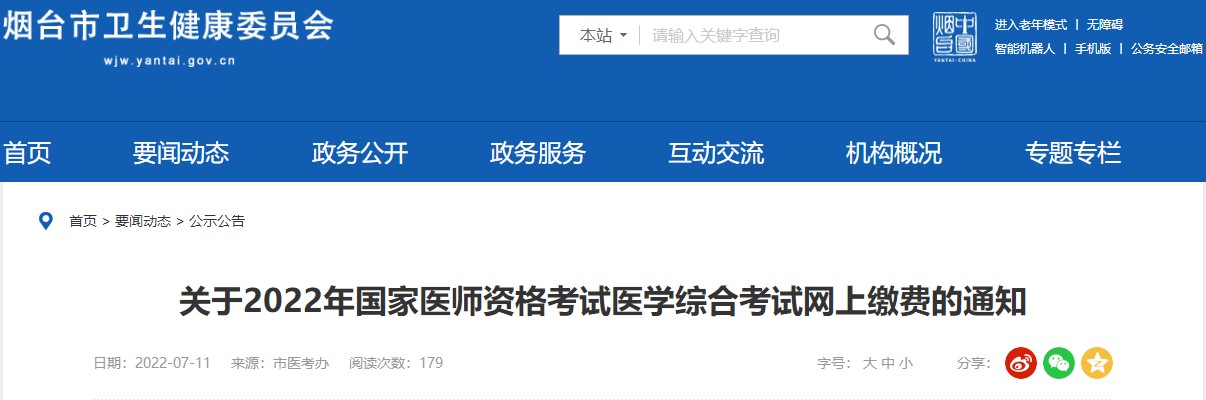 關(guān)于煙臺考點2022年國家醫(yī)師資格考試醫(yī)學(xué)綜合考試網(wǎng)上繳費的通知