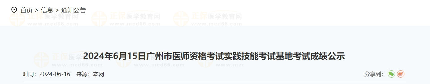廣東省廣州市2024年6月15日醫(yī)師資格考試實踐技能考試基地考試成績公示