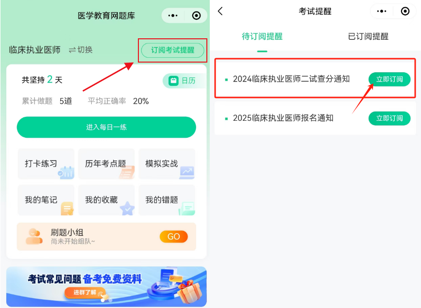 點(diǎn)擊右上角“訂閱考試提醒”按鈕,選擇“2025臨床執(zhí)業(yè)醫(yī)師成績查詢通知”立即訂閱即可。成績公布后會為已訂閱考生進(jìn)行通知推送。