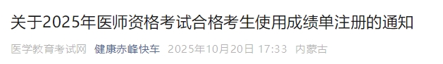 內(nèi)蒙古赤峰2025年醫(yī)師資格考試合格考生使用成績單注冊的通知