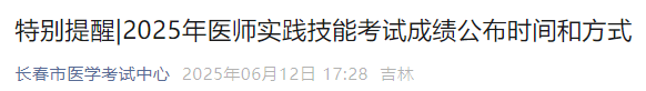 吉林長春官方發(fā)布特別提醒:2025年醫(yī)師資格實踐技能考試成績考后72小時官網(wǎng)可查!請相關(guān)考生及時了解,考后關(guān)注成績!