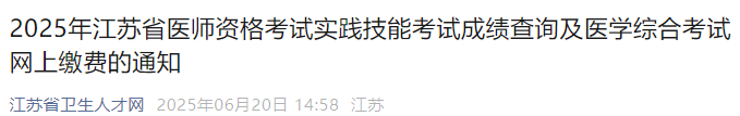 江蘇省2025年醫(yī)師資格實(shí)踐技能考試成績23號(hào)可查!注意筆試?yán)U費(fèi)時(shí)間!以下為江蘇省官方發(fā)布的通知,請相關(guān)考生及時(shí)查看。
