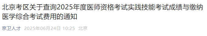 官方速報(bào)!北京2025年醫(yī)師資格實(shí)踐技能成績(jī)查詢?nèi)肟谝验_(kāi)通!請(qǐng)相關(guān)考生及時(shí)查詢技能考試成績(jī),同時(shí)注意綜合筆試?yán)U費(fèi)時(shí)間!