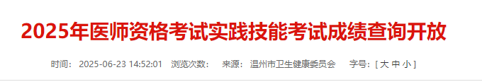 根據(jù)浙江溫州考點官方通知:浙江省2025年醫(yī)師資格實踐技能考試成績6月24日起官網(wǎng)可查!請相關考生及時查詢自己的技能考試成績,并關注后續(xù)的綜合筆試繳費時間!