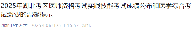 湖北省官方發(fā)布通知:2025年醫(yī)師資格實(shí)踐技能考試成績(jī)可以在6月26日起登錄國(guó)家醫(yī)學(xué)考試網(wǎng)查詢,請(qǐng)相關(guān)考生及時(shí)查看,并注意后續(xù)筆試?yán)U費(fèi)時(shí)間安排!